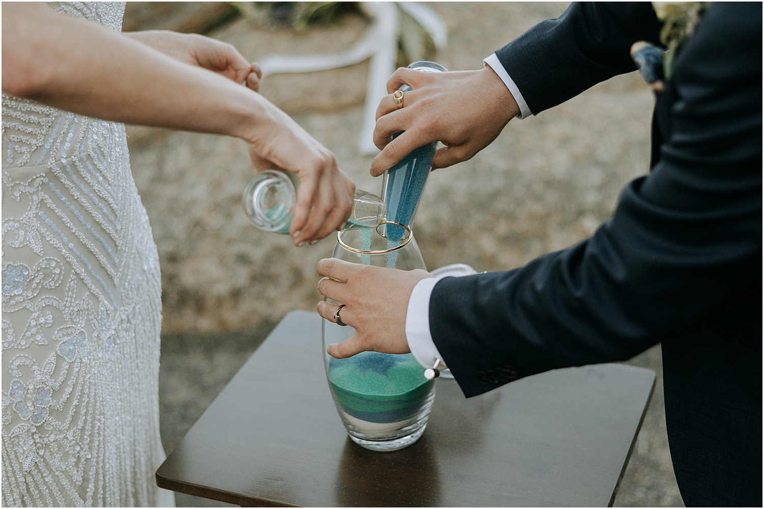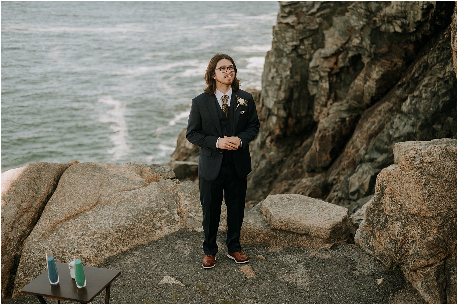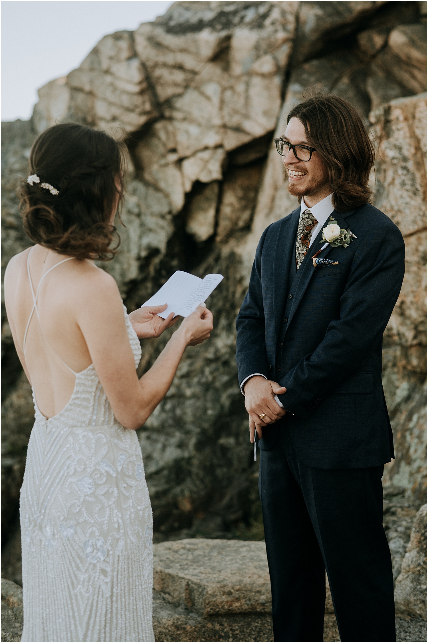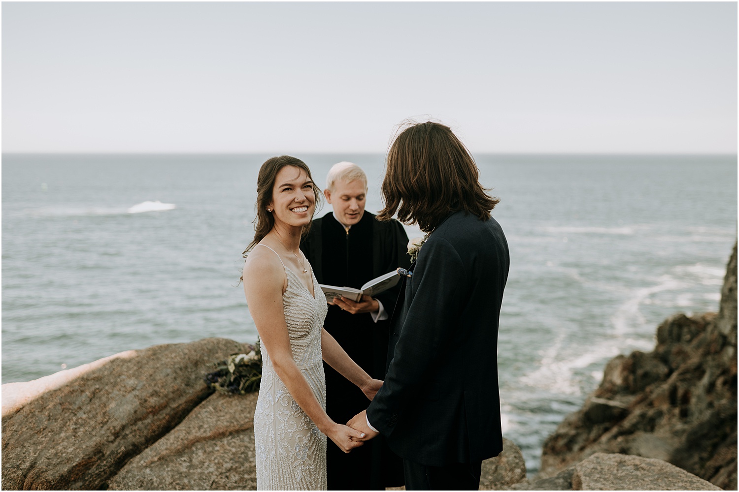 We headed into the park, and as I have always found in Acadia, you have to expect changes and obstacles. On that day, these came in the form of climbers on Otter Cliff. We decided that wasn’t the best spot for the wedding, and so we shifted gears and headed to another spot on the trail. But it was still absolutely stunning, wait until you see! My favorite Bar Harbor and Acadia Wedding Officiant, Adam Babish, helped the couple with a sand ceremony. They used grains of sand from right there in Acadia. This was such a special ritual and memento that they’ll have forever.