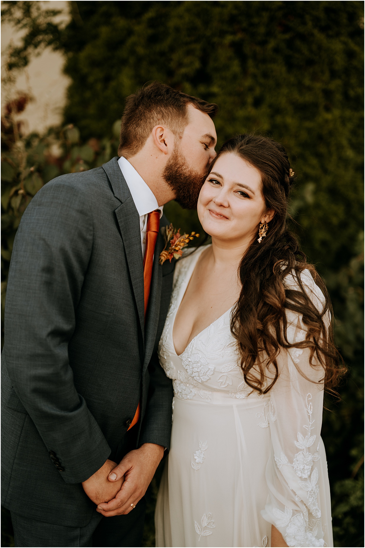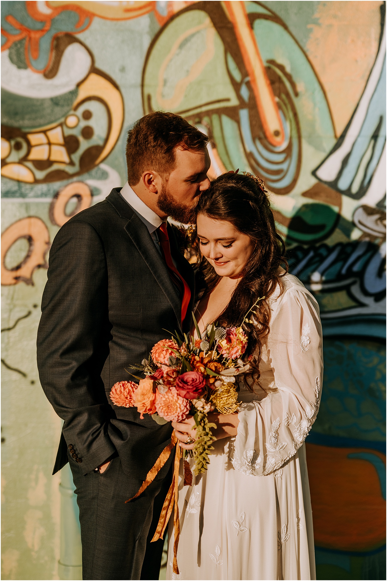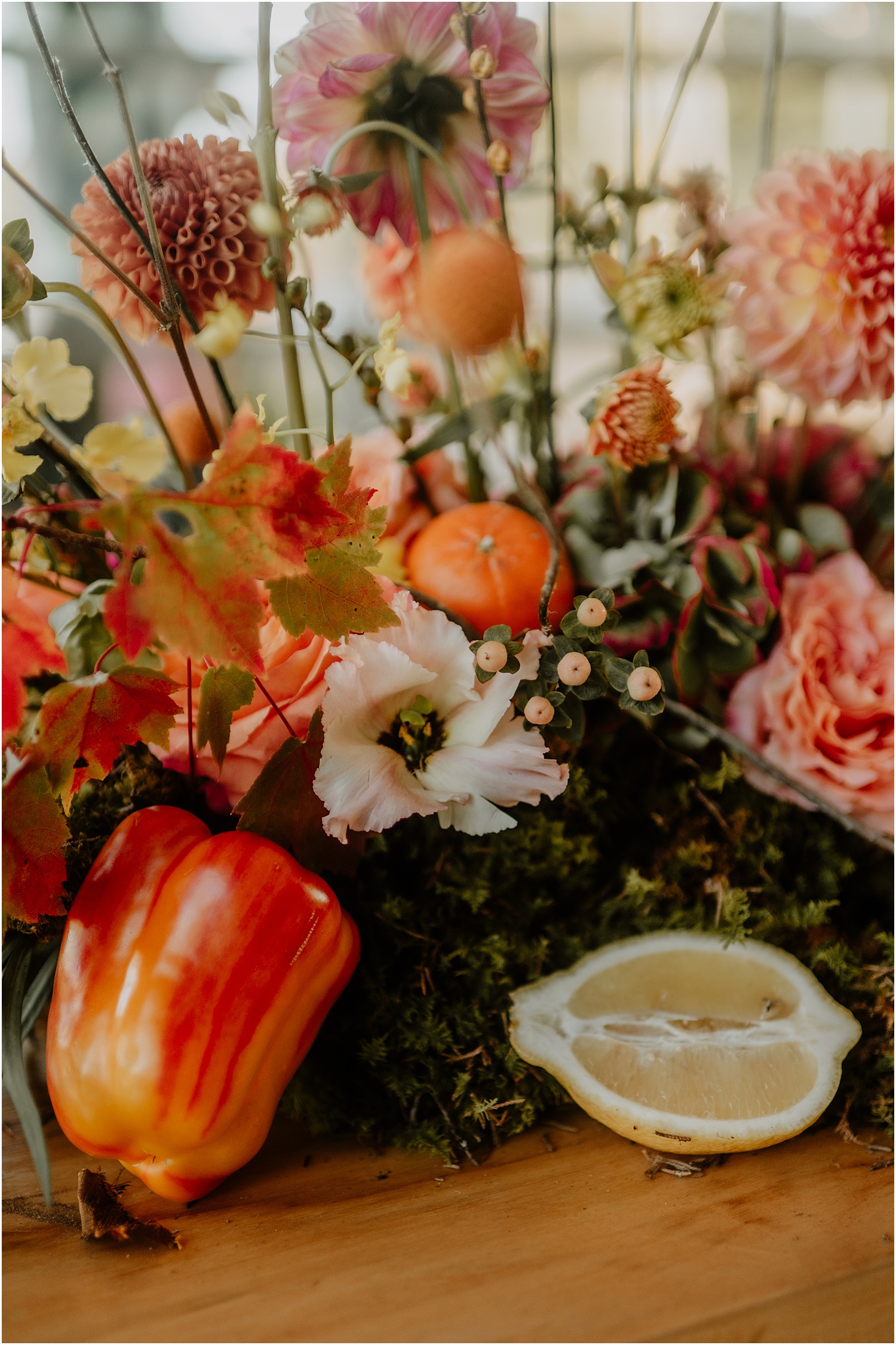 The couple added so many personal touches to their wedding celebration. From the invitations, paper goods, and stickers personally designed by Allie, to the unique floral arrangements created by Electric Flora. These beautiful bouquets included not only flowers, but a mix of fruits and vegetables–and they were spectacular!