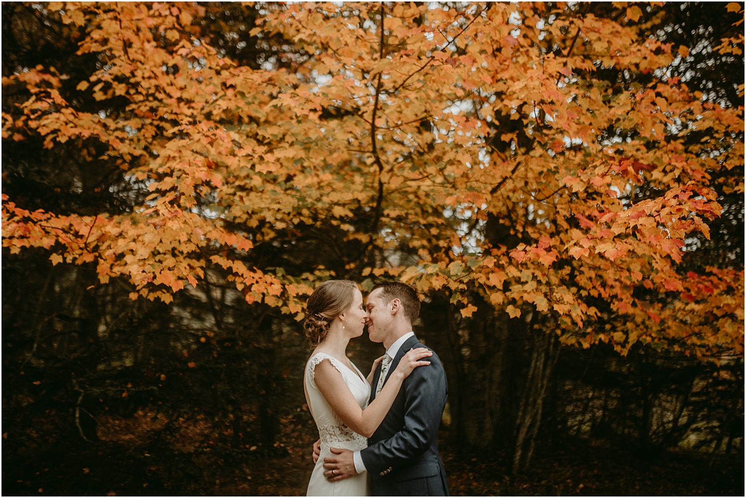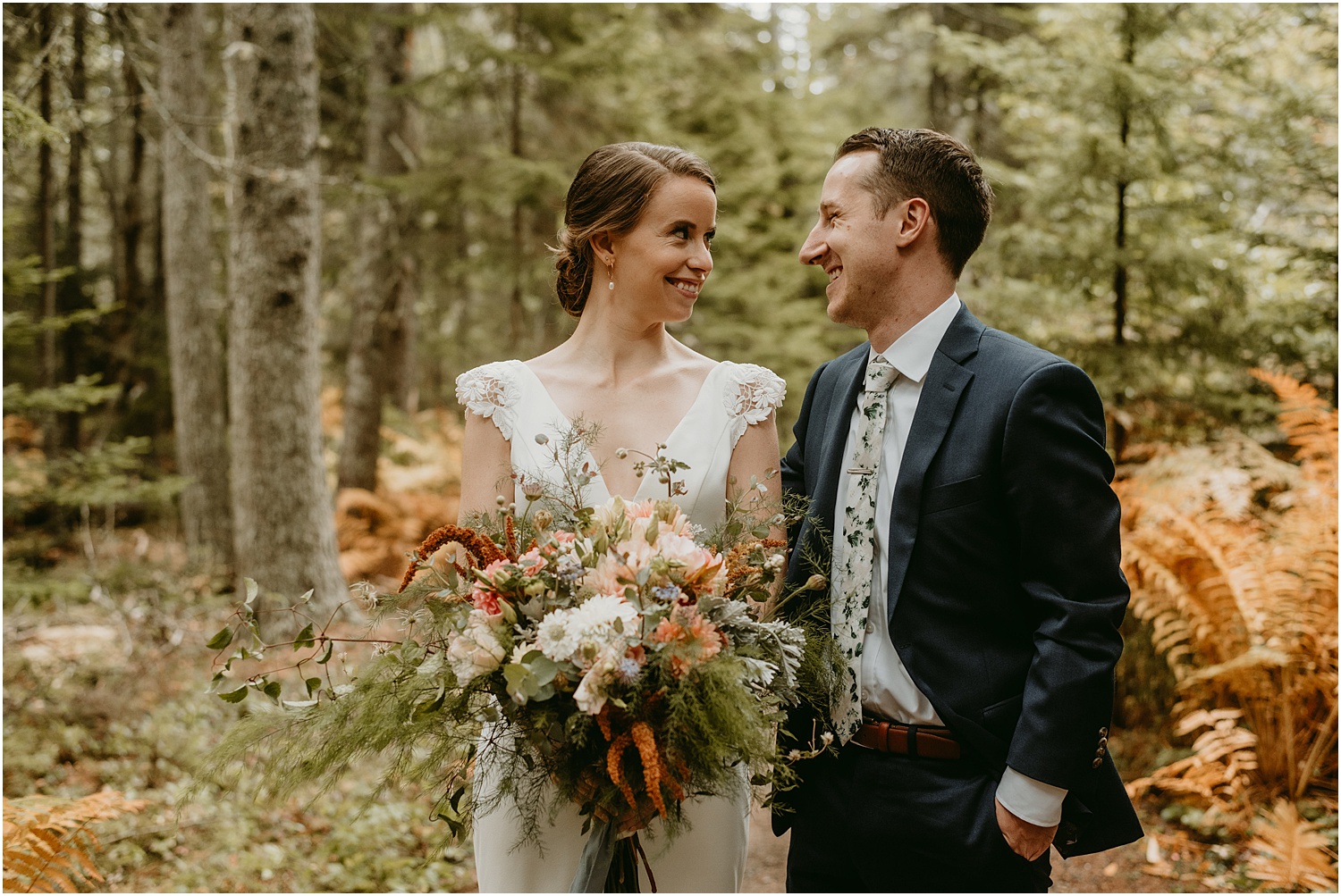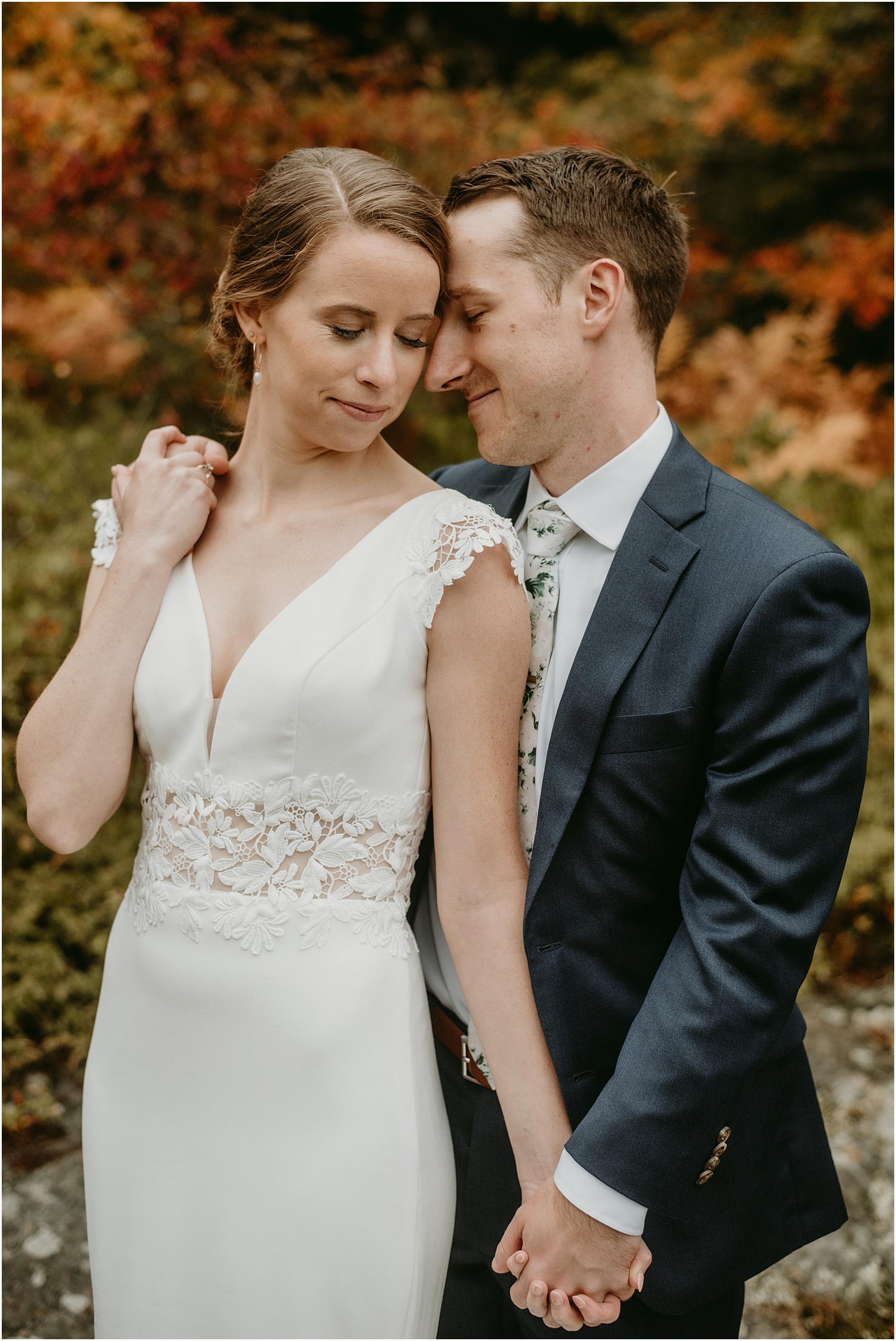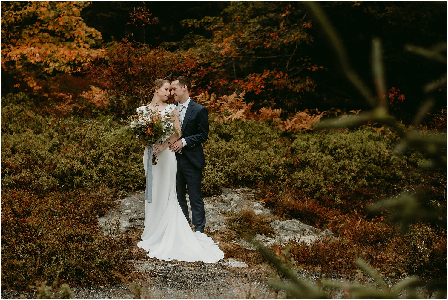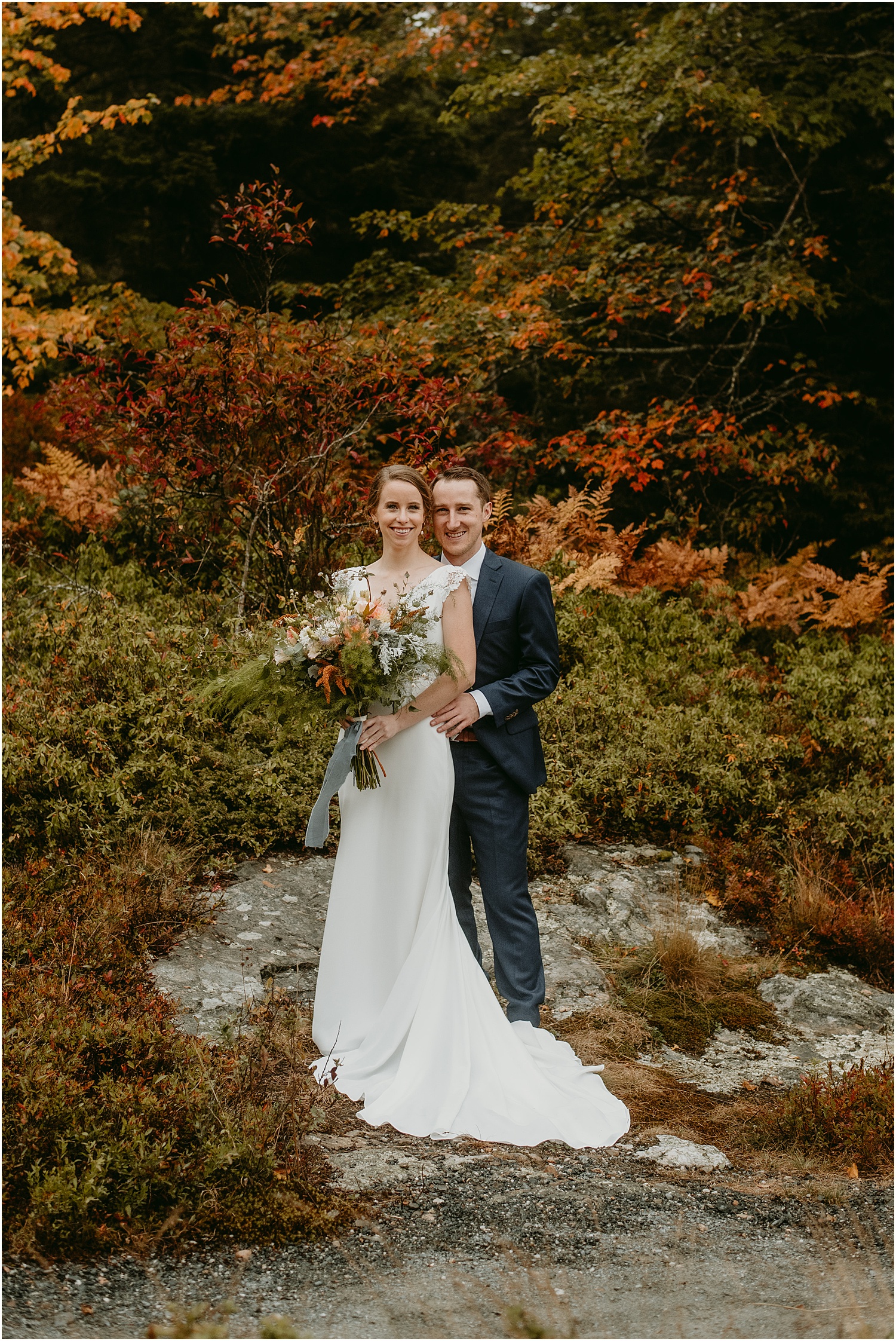 On a blustery Monday on Mount Desert Island, Caroline + Sam exchanged the sweetest vows during their Bar Harbor Adventure Elopement. Along the trail to their ceremony site, they received many congratulations from hikers and onlookers. However, we were able to snag a little quietness for portraits in the foliage. The ceremony took place on Ship Harbor Trail in Southwest Harbor Maine, just outside of Bar Harbor in a more secluded area.