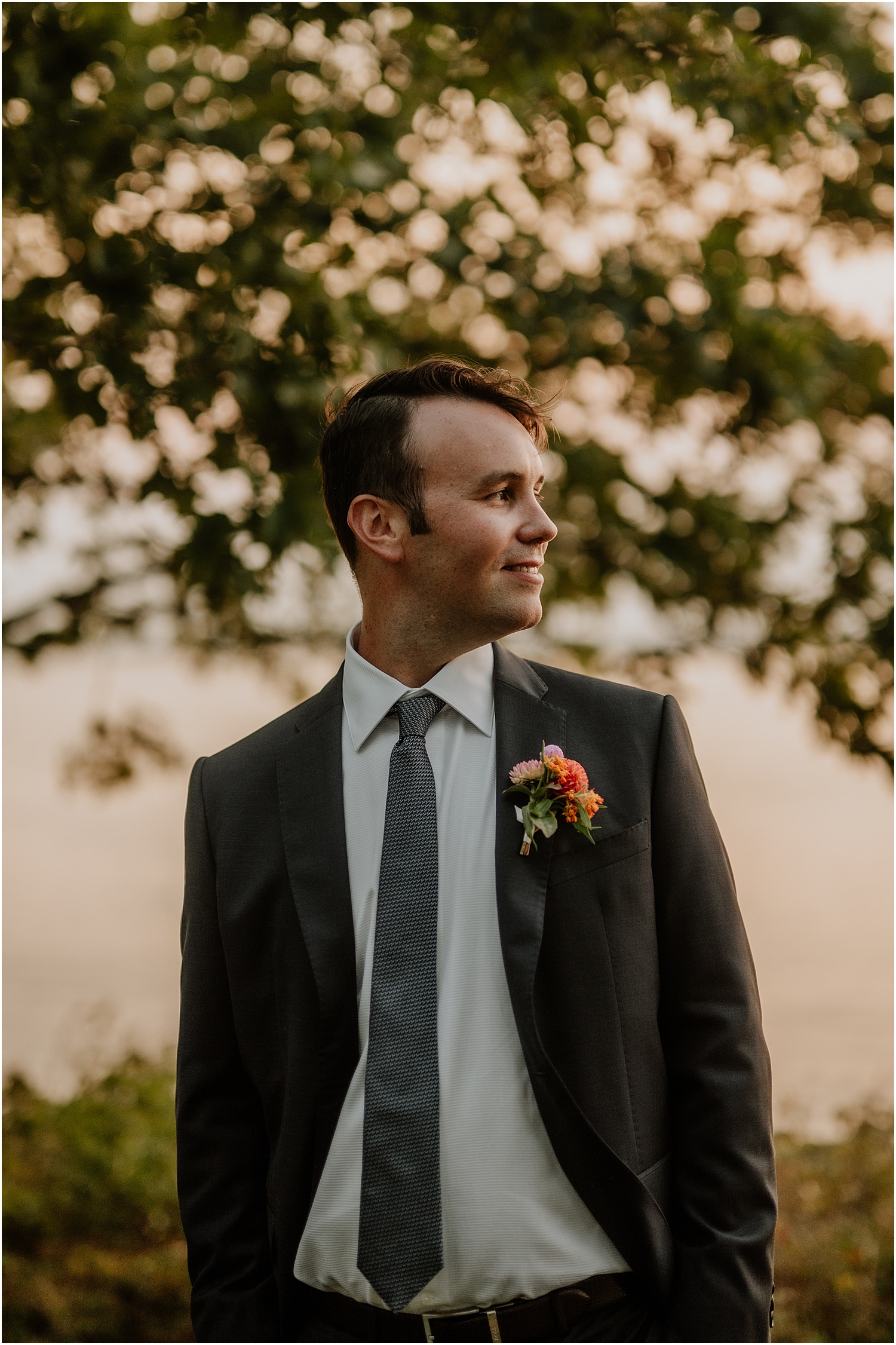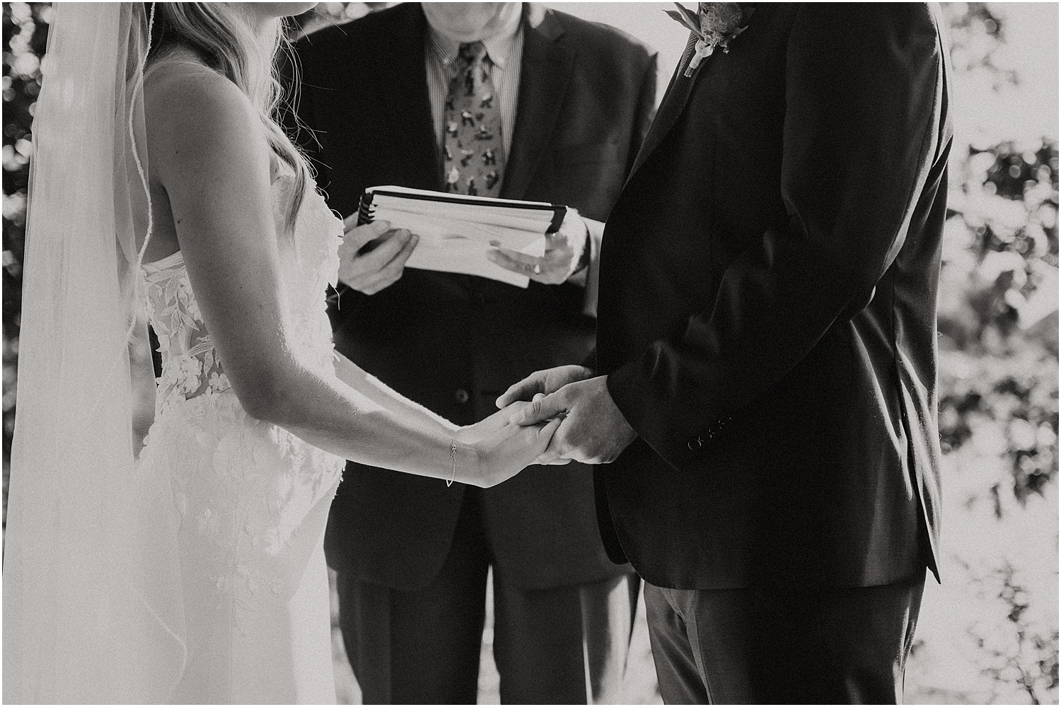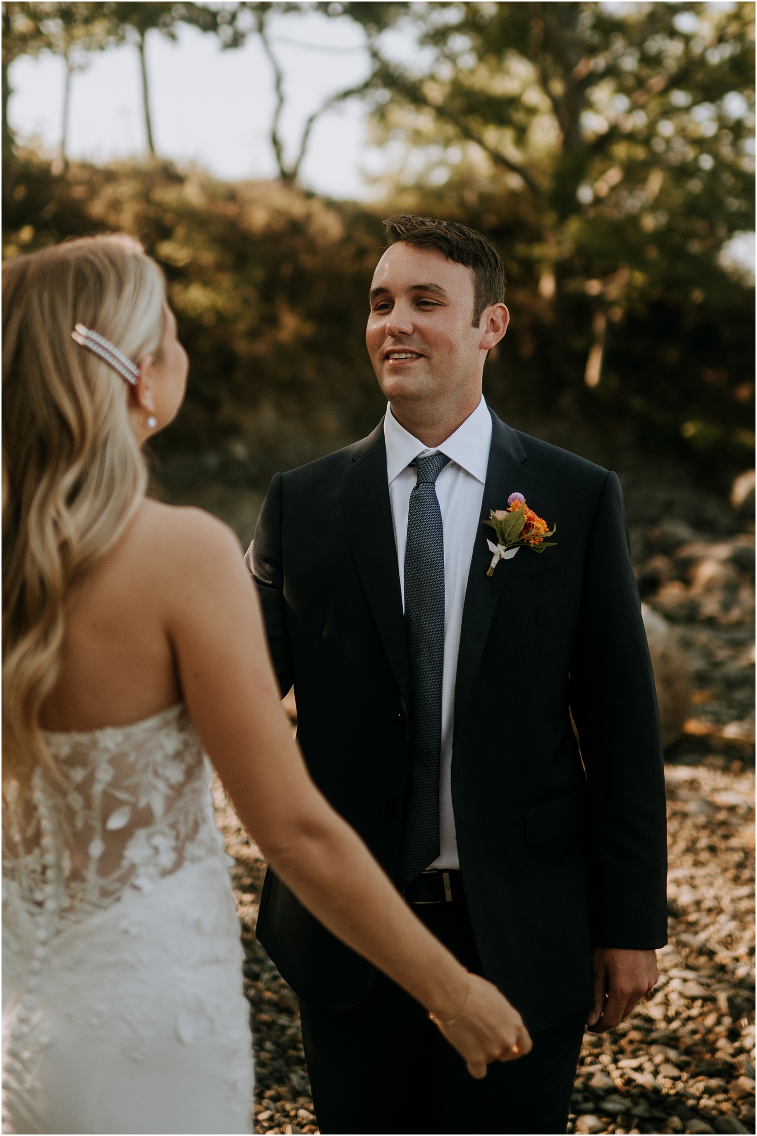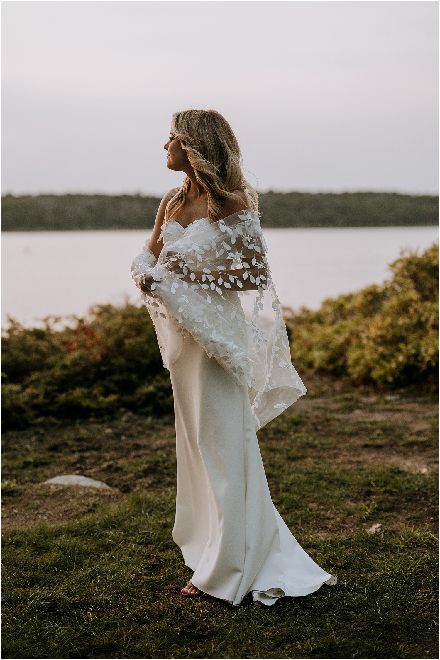 Katie wore a simple gown with flair, and she looked absolutely radiant with her hair and make-up all done-up for the ceremony. She even used fabric from the long train as a shawl to wear for the sunset portraits. This was a beautiful and unique touch!