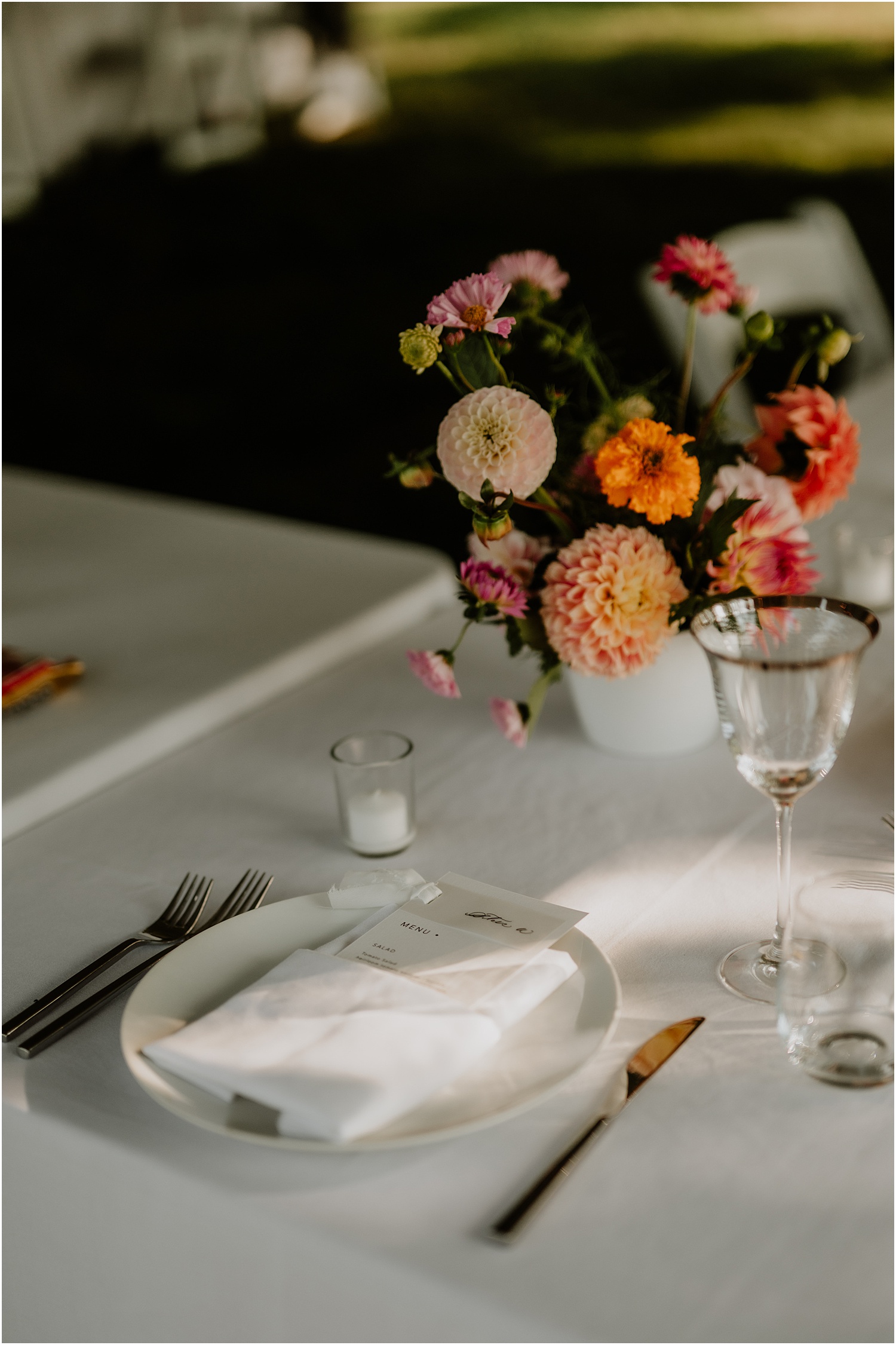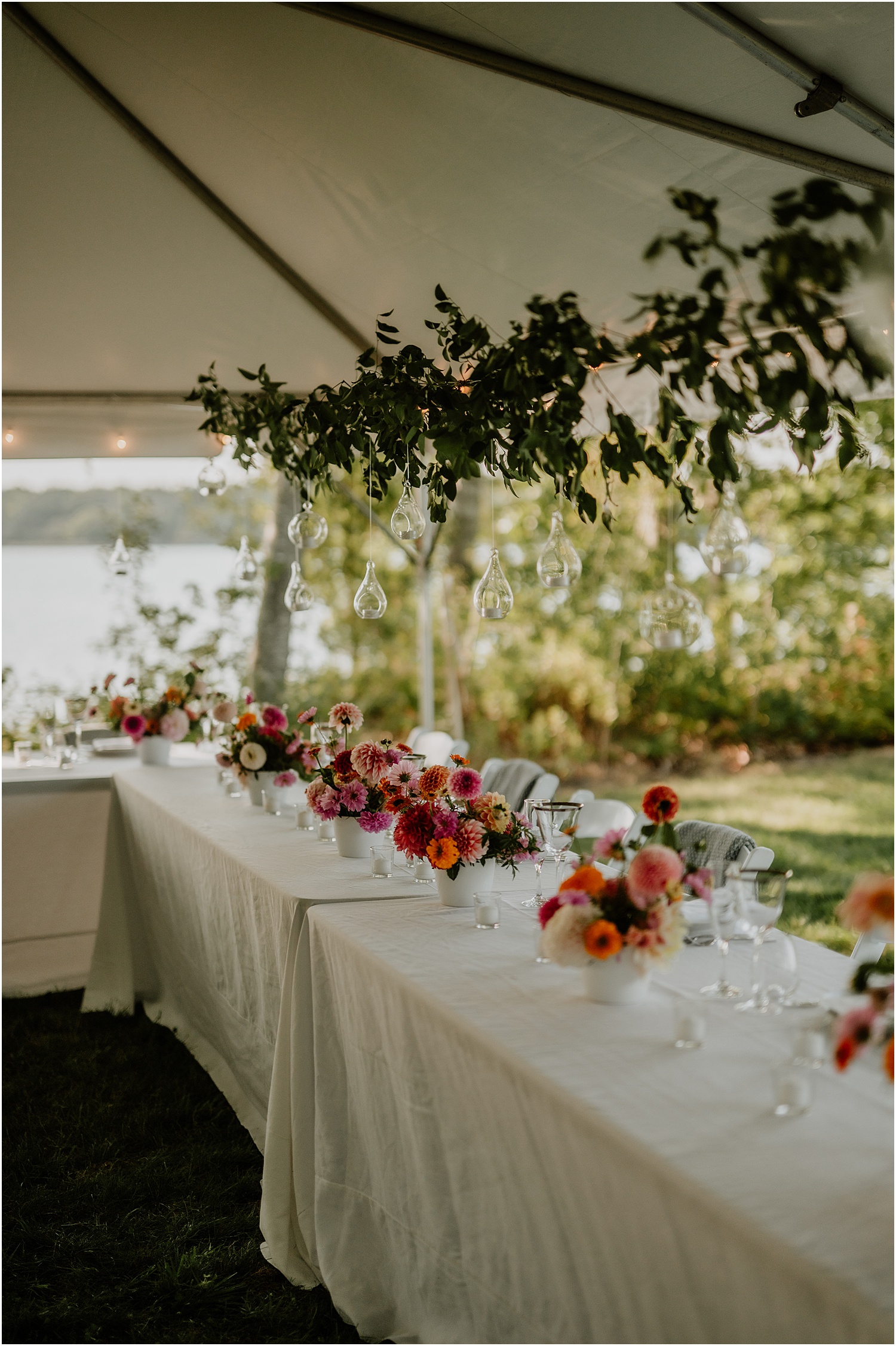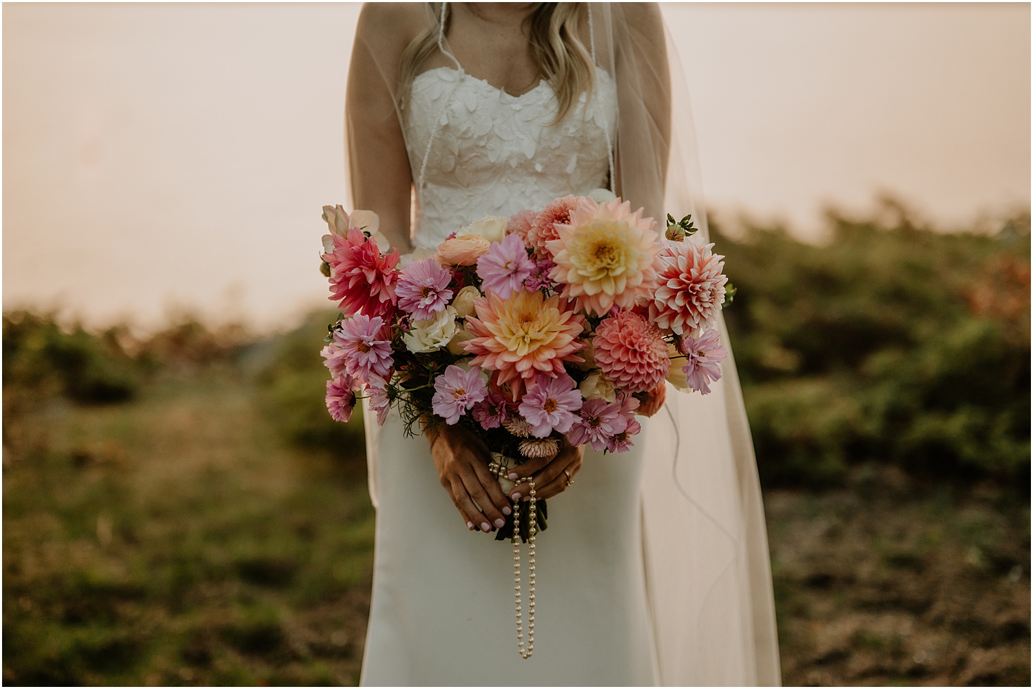 FIELD Floral Studio designed the flower arrangements and handled day-of coordination. Their florists also created the stunning bouquet that Katie carried. The romantic and whimsical flowers perfectly matched the ambiance of the ceremony, and the seasonal pink and purple dahlias added pops of color against the grays of the coastal scenery.