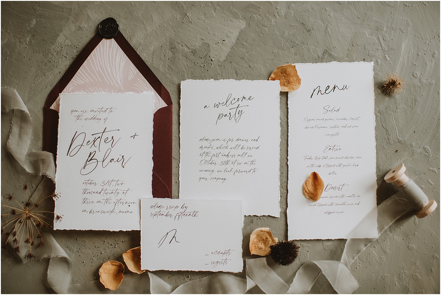 Let’s jump right in to some Maine Autumn Bridal inspiration from this perfectly moody styled shoot. This editorial’s florals were created almost entirely with foraged leaves and other foliage from the forests surrounding the venue, making this shoot very eco-friendly and locally-sourced, something that is very important to all vendors that participated. It’s often difficult to achieve lush florals this late into the year in the Northeast without getting flowers shipped in, and with COVID that’s even tougher, so we wanted to showcase a day that was late fall, and lush as heck, and local – it can be done!