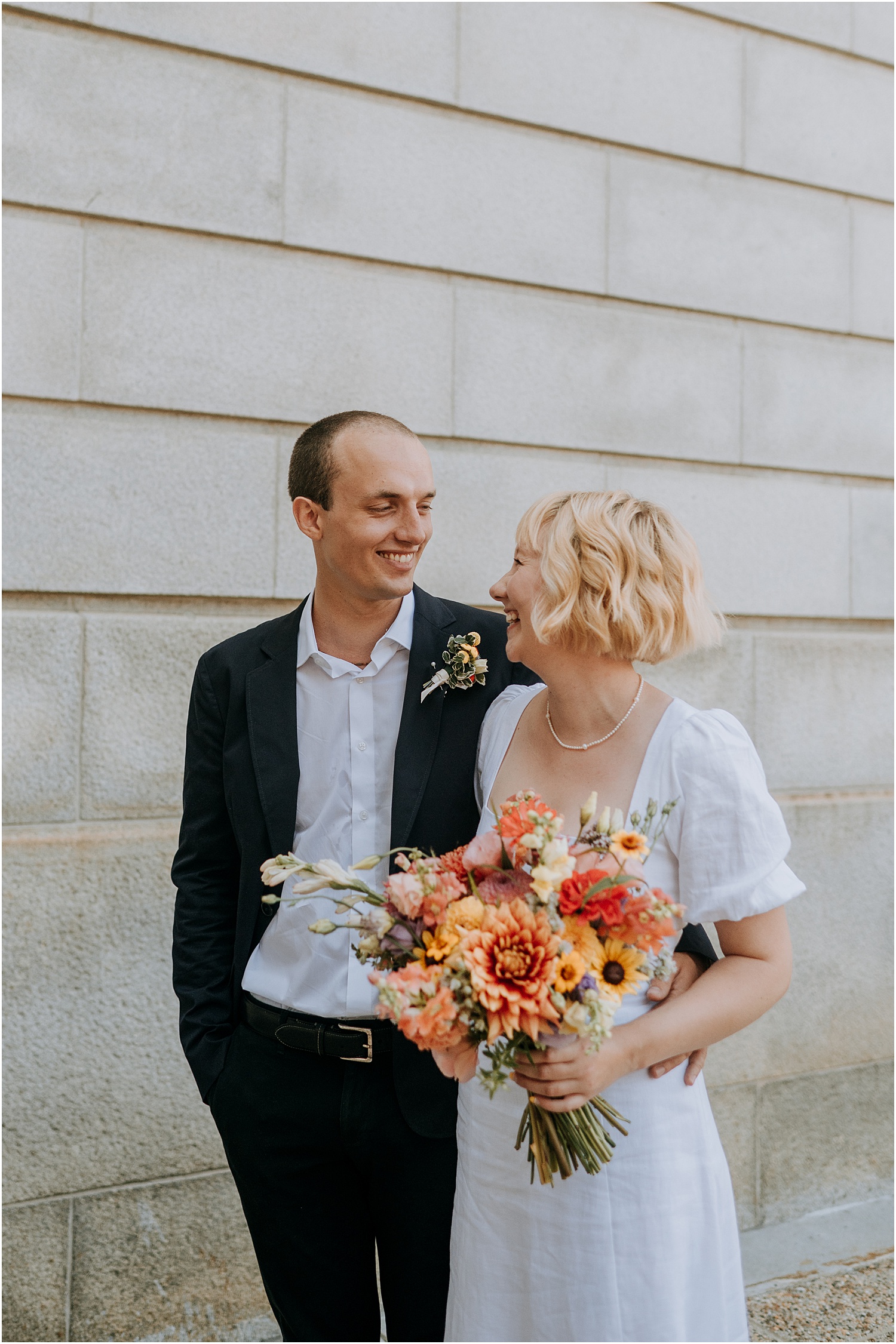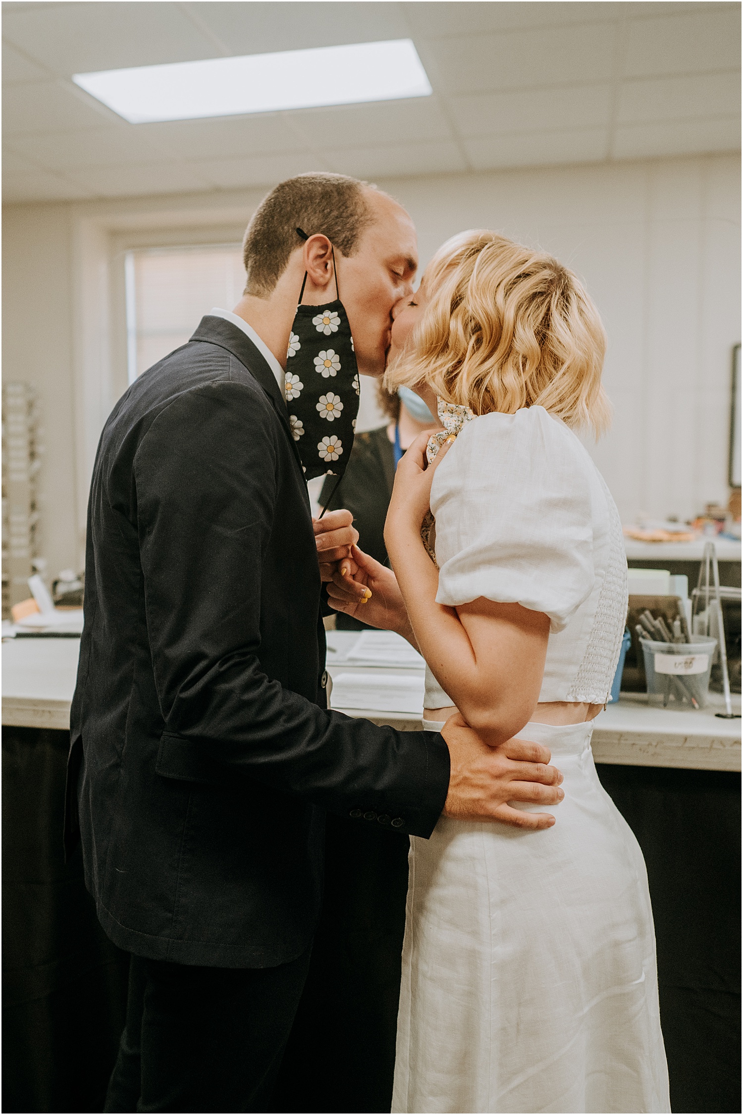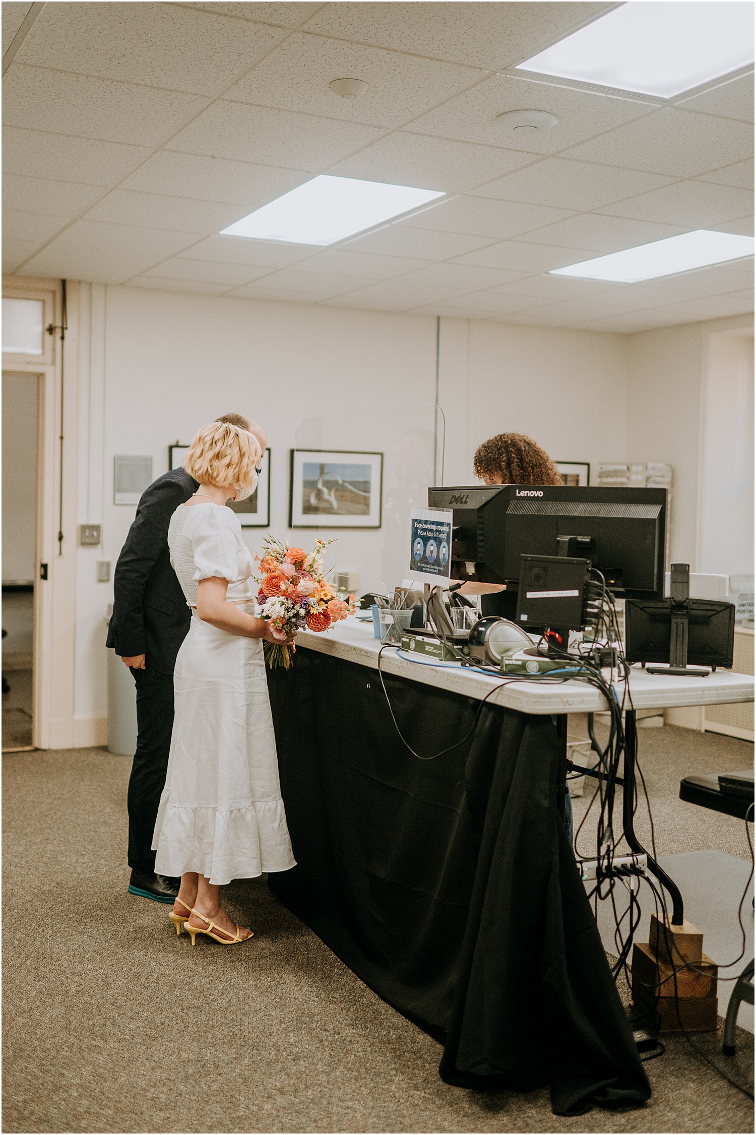 Due to the pandemic, the officiation was required to take place in the basement of City Hall. While the surrounding scenery was mundane, the “ceremony” was anything but – loved ones Zoomed in and those lucky enough to attend in person helped brighten the space (you can’t tell but everyone was smiling under their masks). Check out another small wedding I photographed at Portland City Hall!