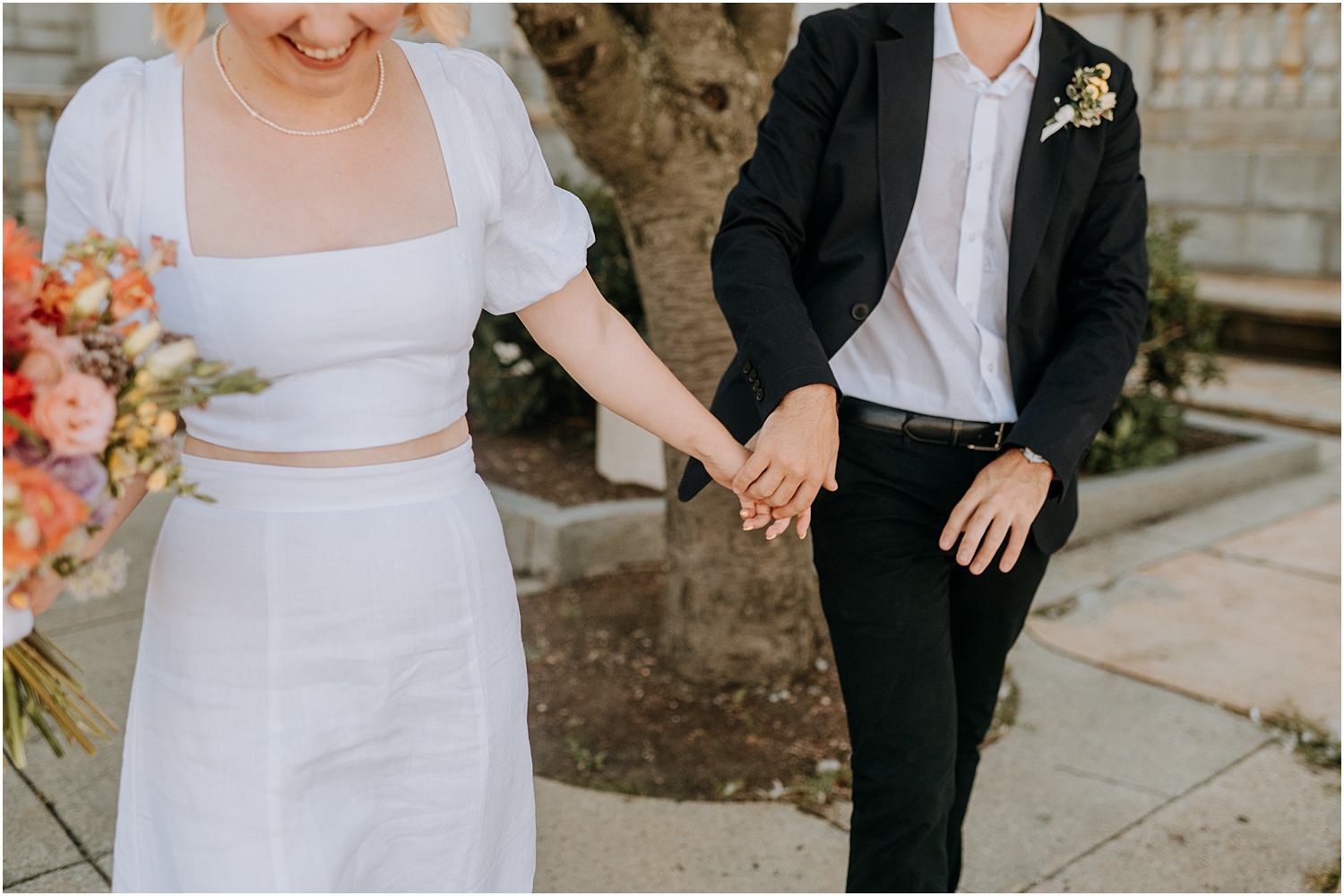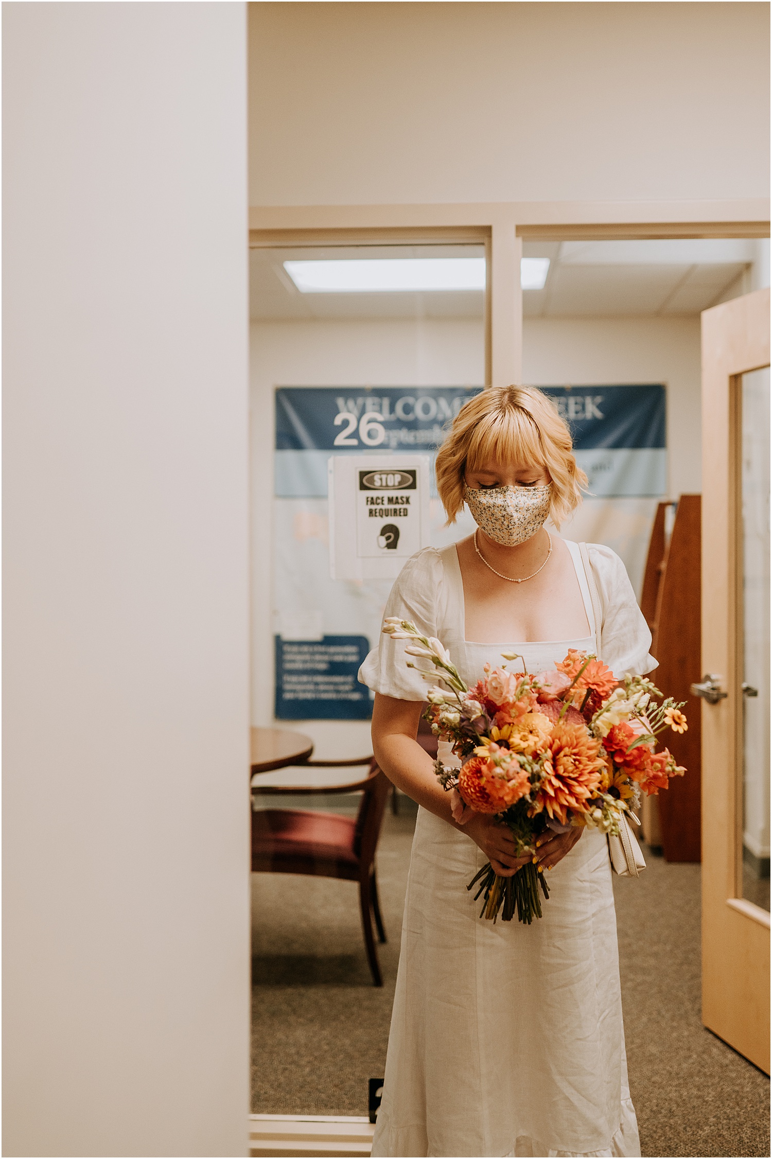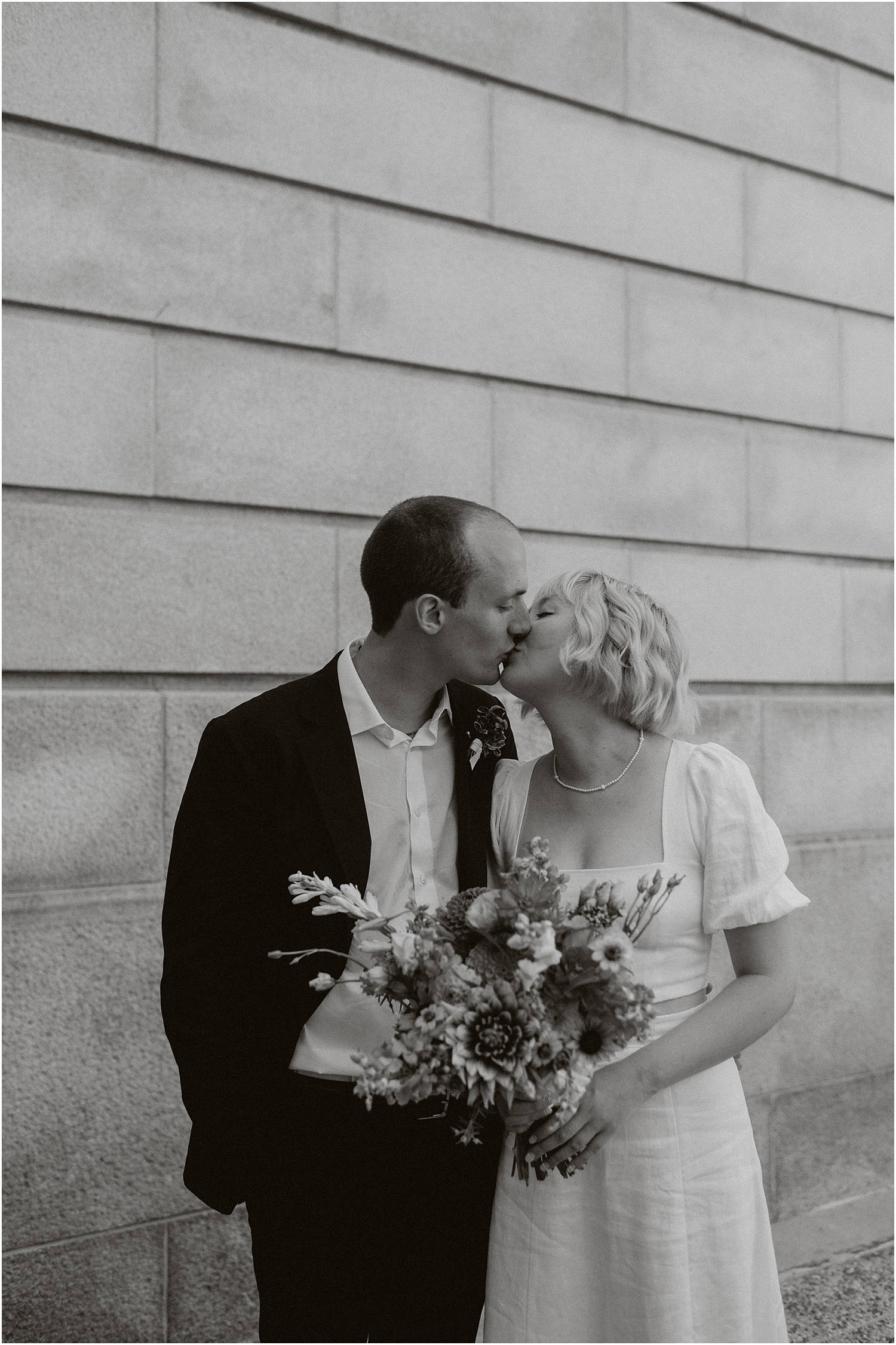 Due to the pandemic, the officiation was required to take place in the basement of City Hall. While the surrounding scenery was mundane, the “ceremony” was anything but – loved ones Zoomed in and those lucky enough to attend in person helped brighten the space (you can’t tell but everyone was smiling under their masks). Check out another small wedding I photographed at Portland City Hall!