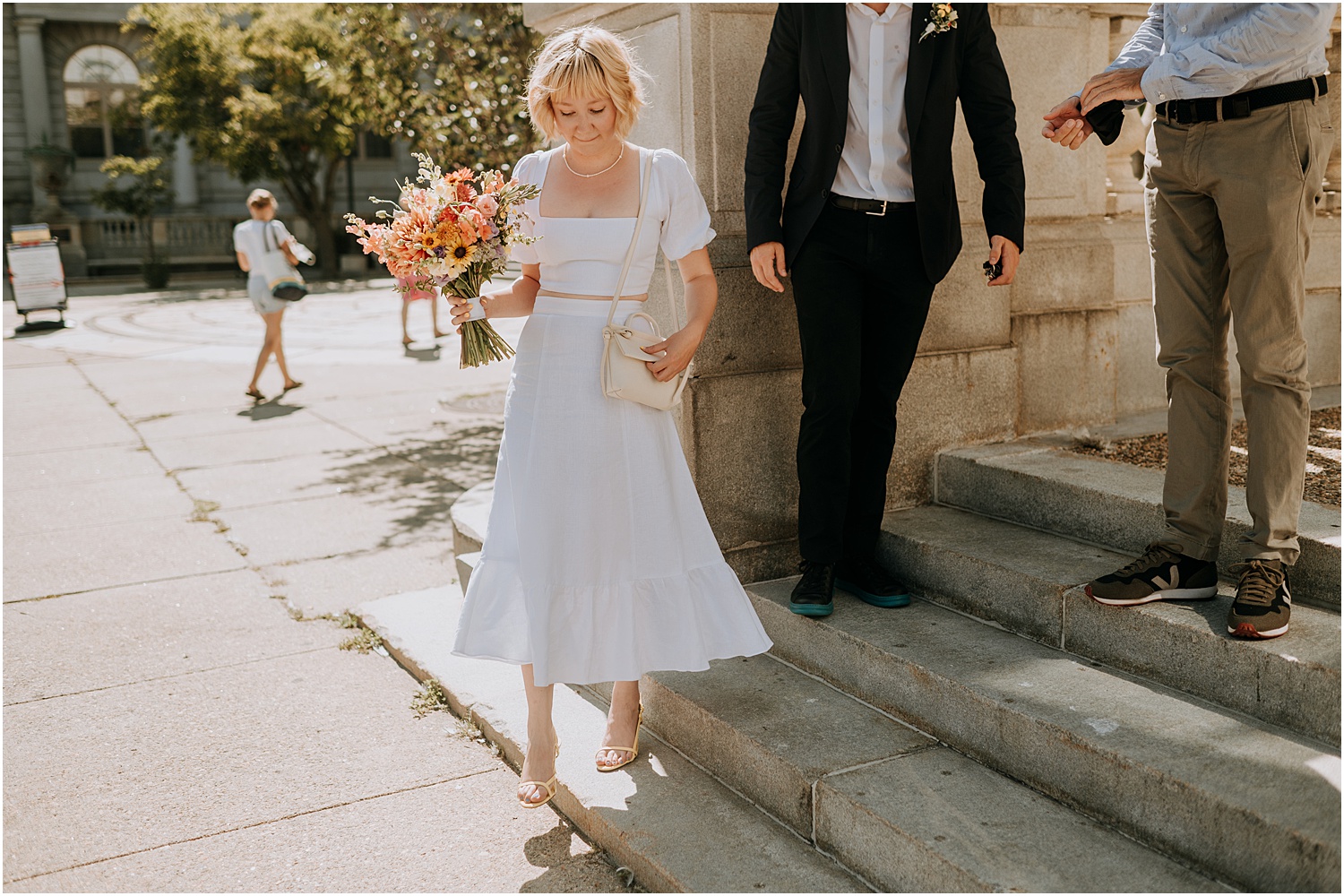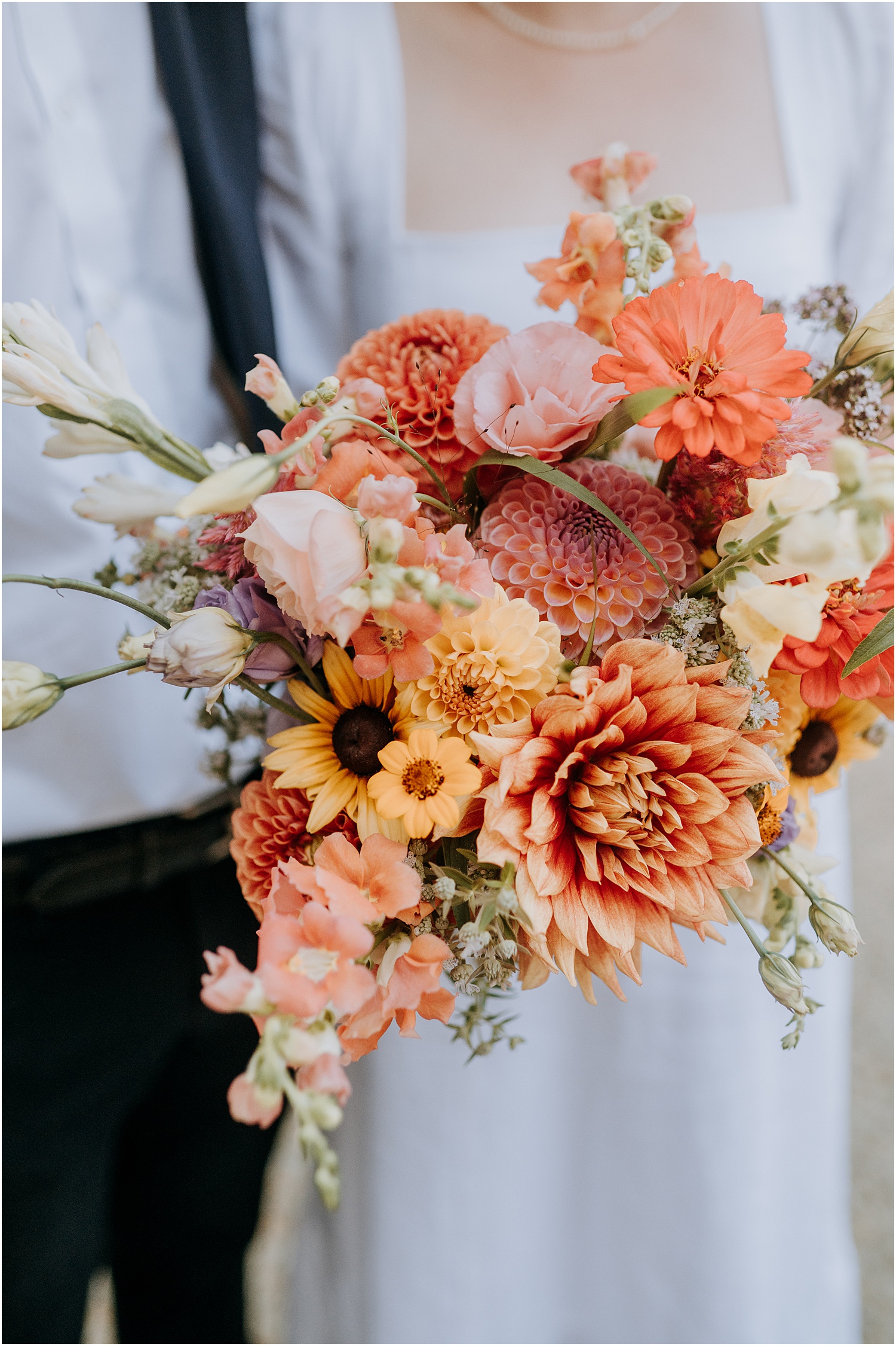 As for the attire: it perfectly matched the feel of the day – fun and a little formal. Ally’s heels were her favorite color, sunshine yellow, and my favorite part of her whole outfit. Another stunning part of the day was the beautiful summer flowers pinned to Arthur’s suit jacket and that made up Ally’s bouquet. The flowers were from Broadturn Farm – the place where Ally works as a flower farmer!
