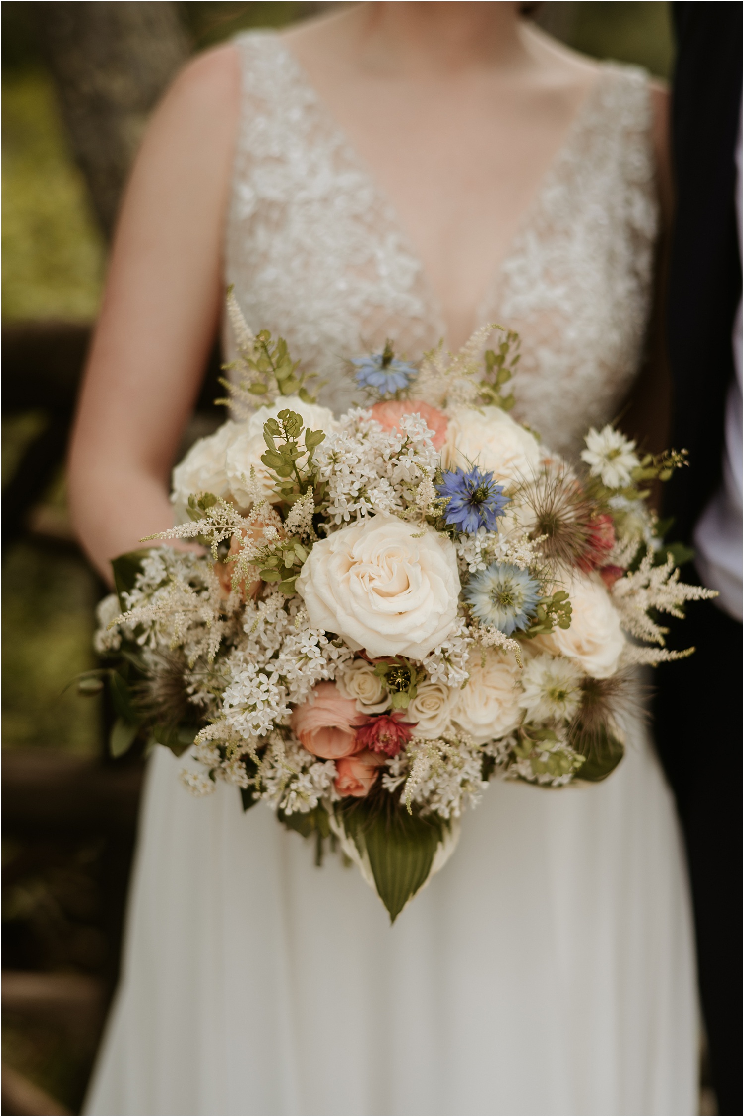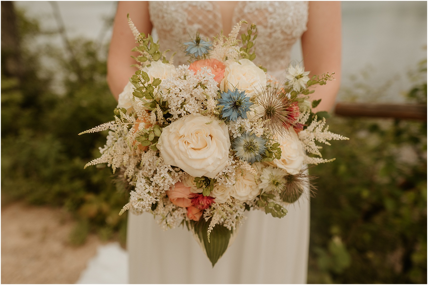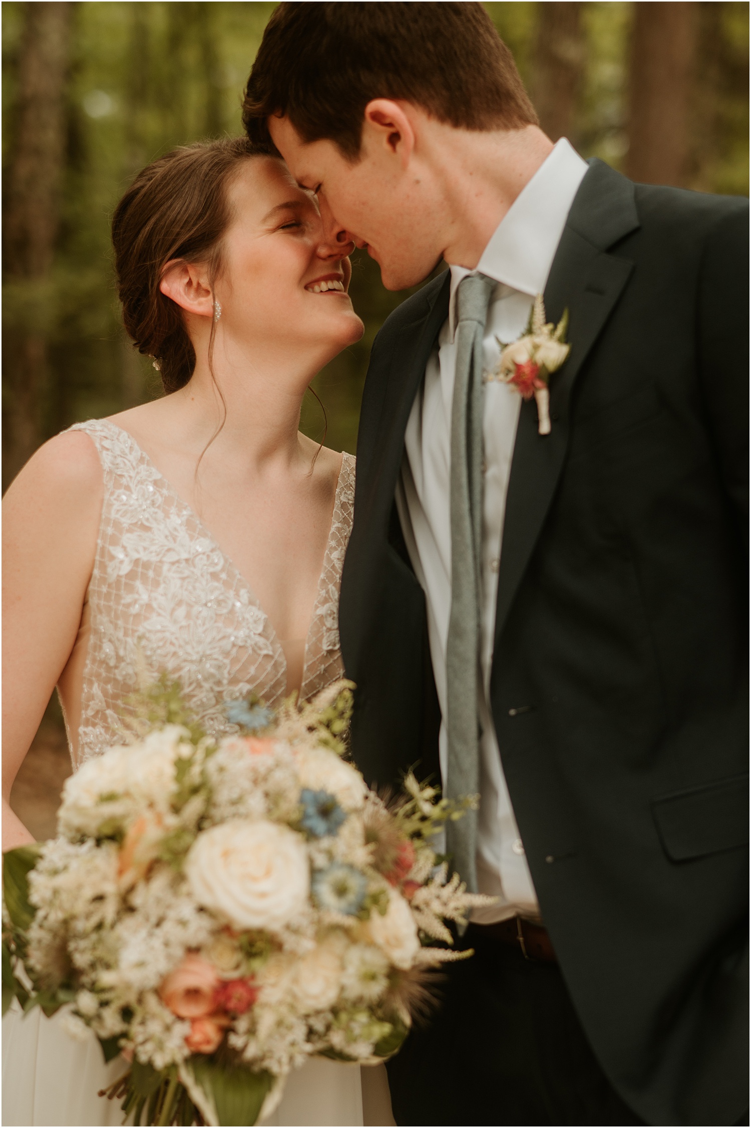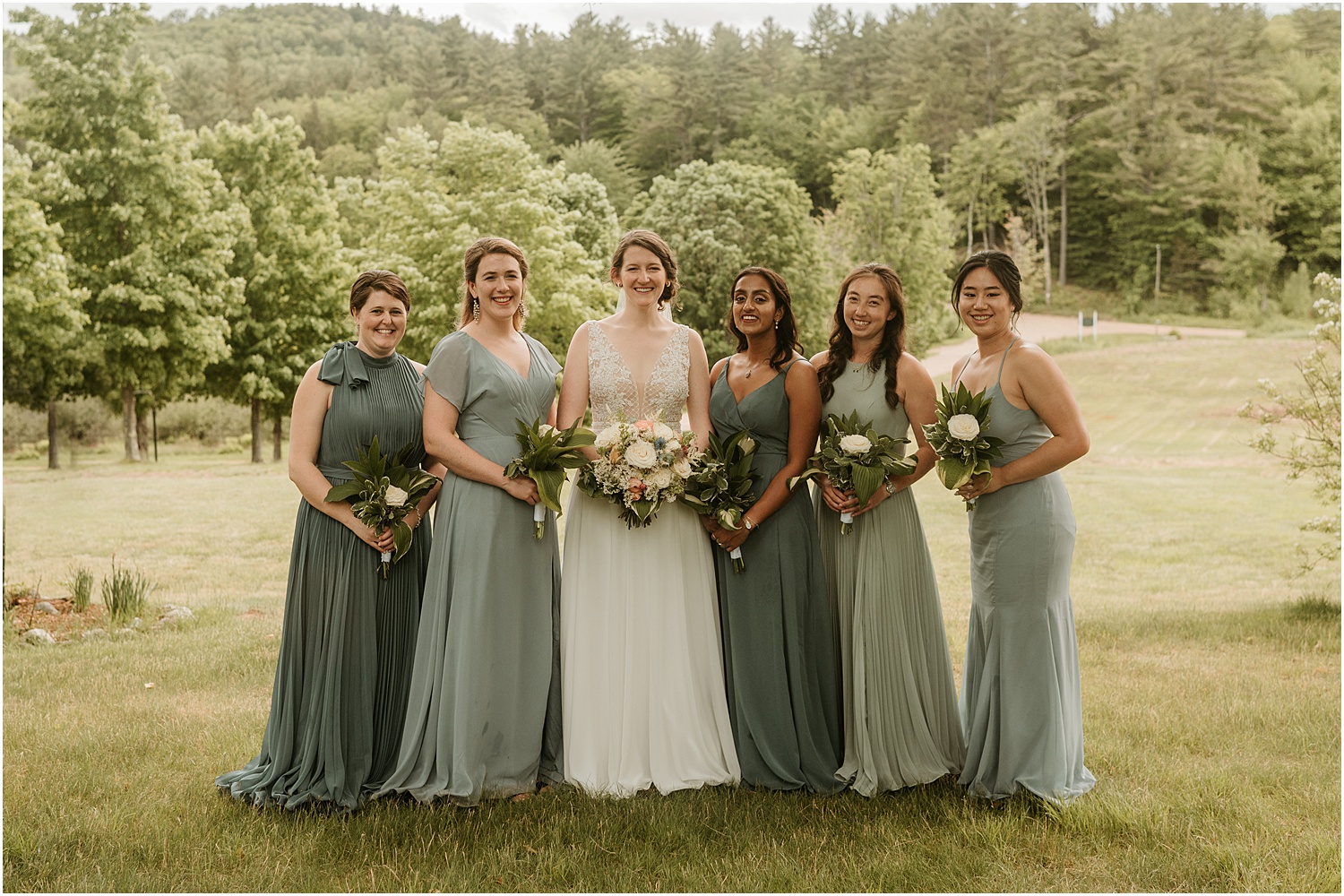 The couple incorporated soft blues, forest greens, and warm whites as their wedding colors which matched the blue sky that set the backdrop for us. (Take a look at the photos to see all of the beautiful green touches like the plants adorning the reception tables, the greenery wrapping around the elegant, white cake, and the soft, beautiful green of the bridesmaid dresses.)