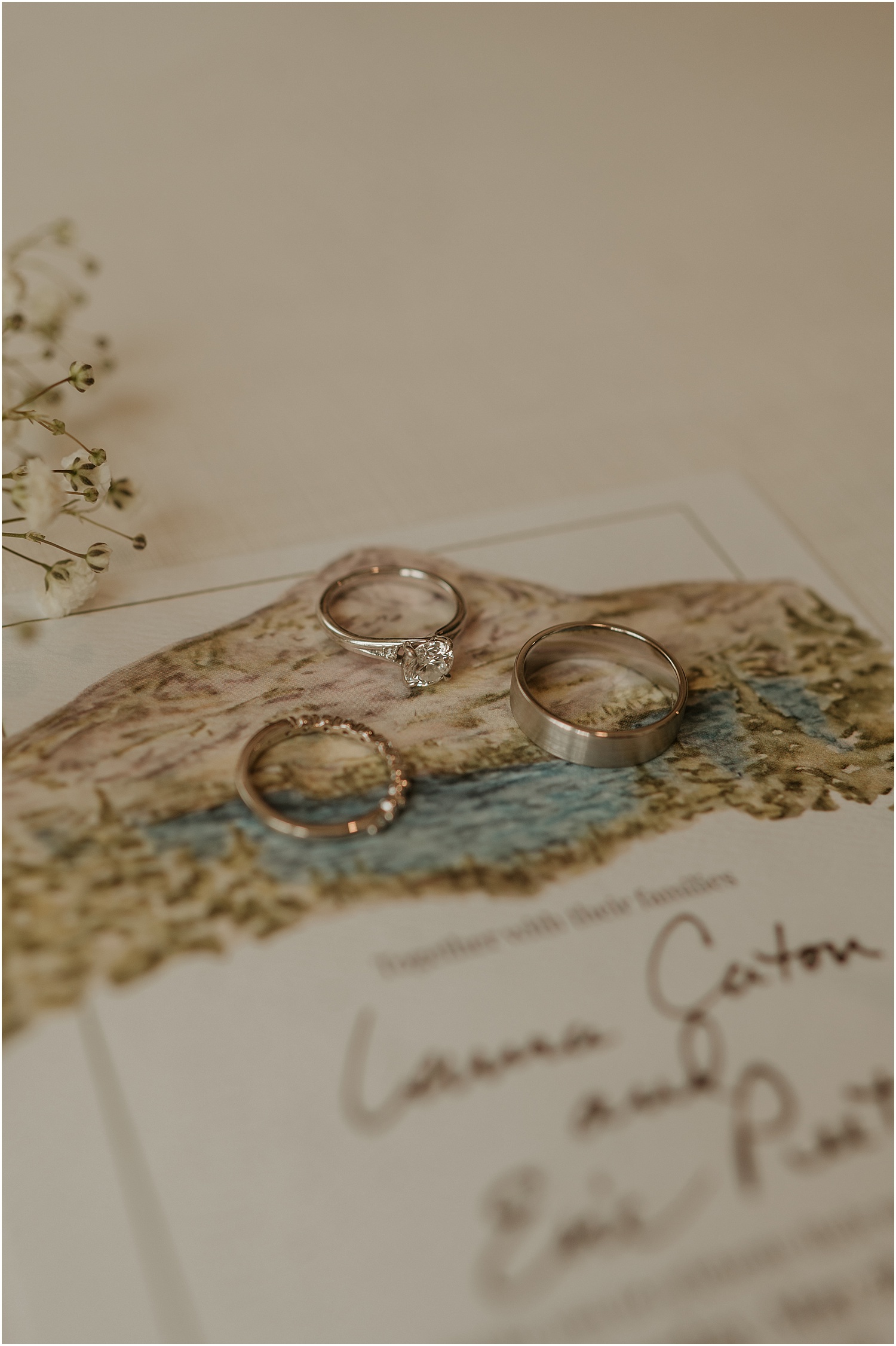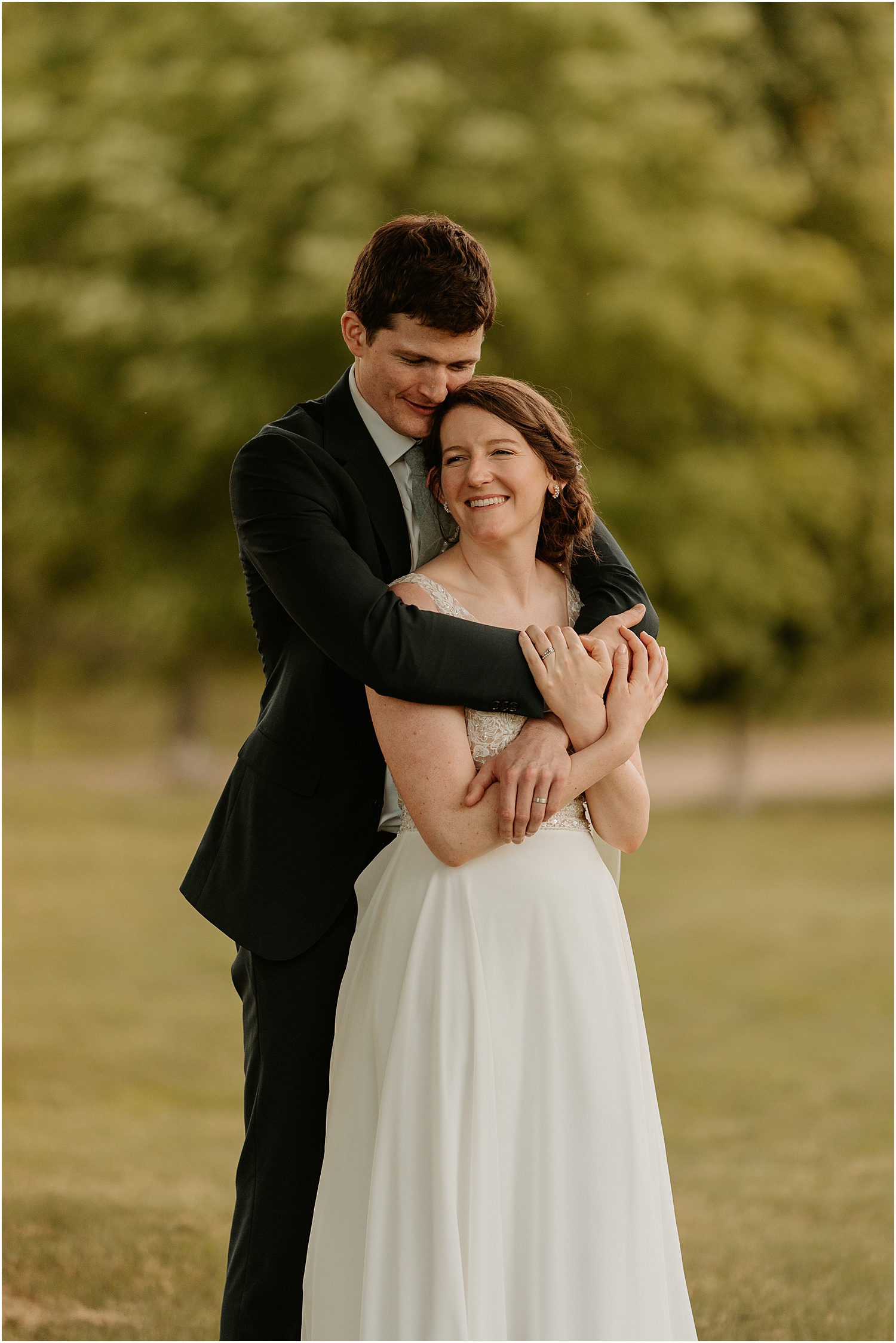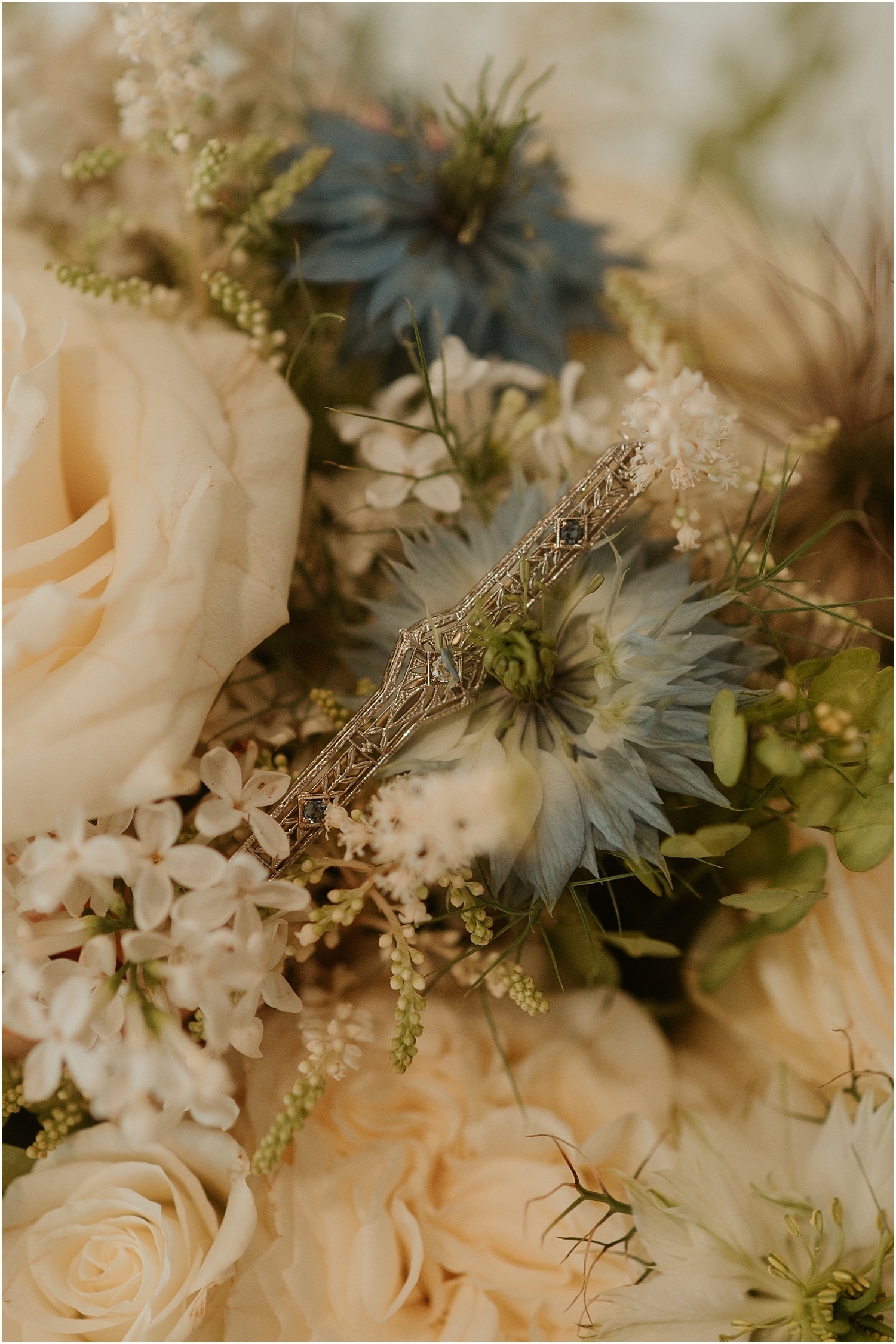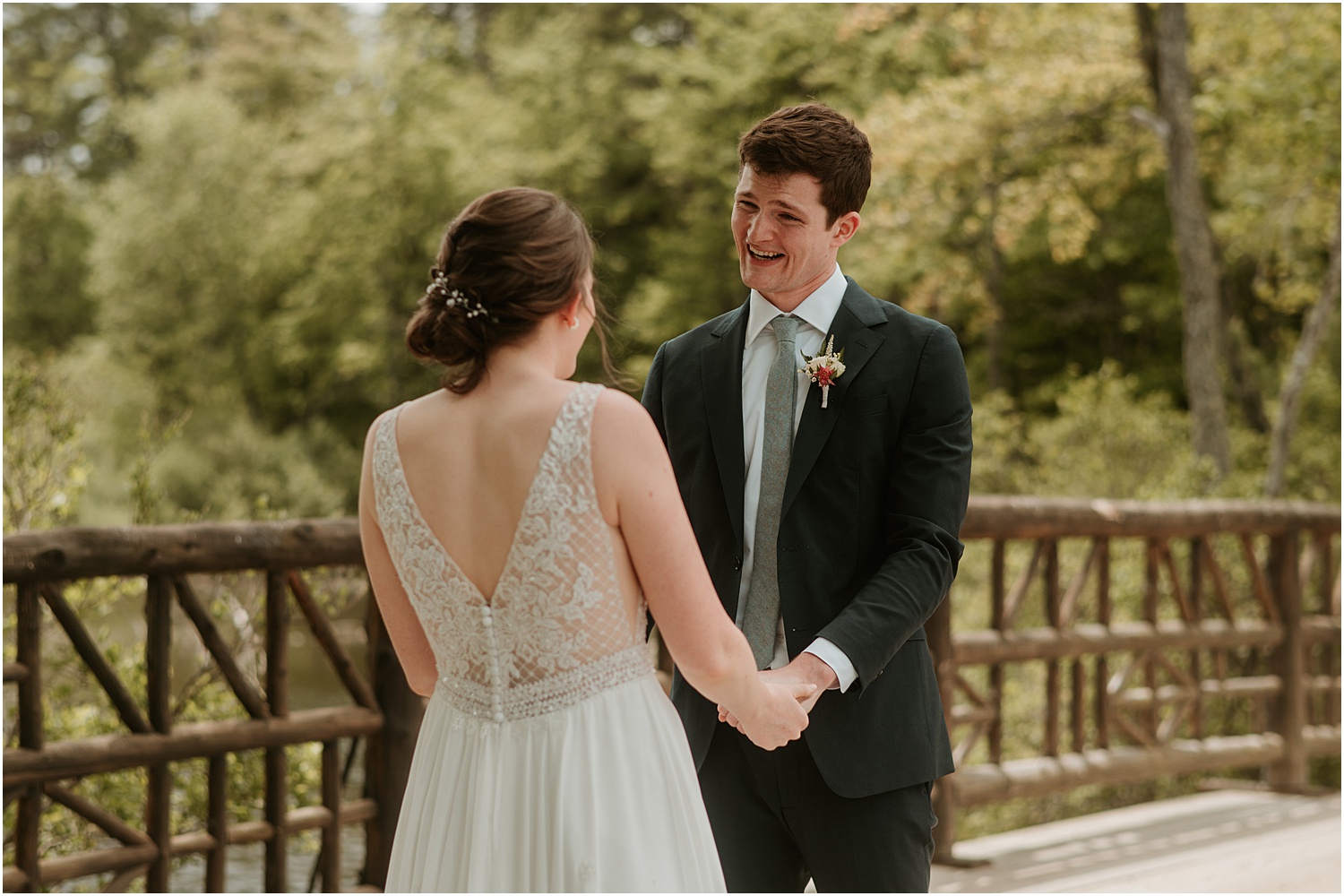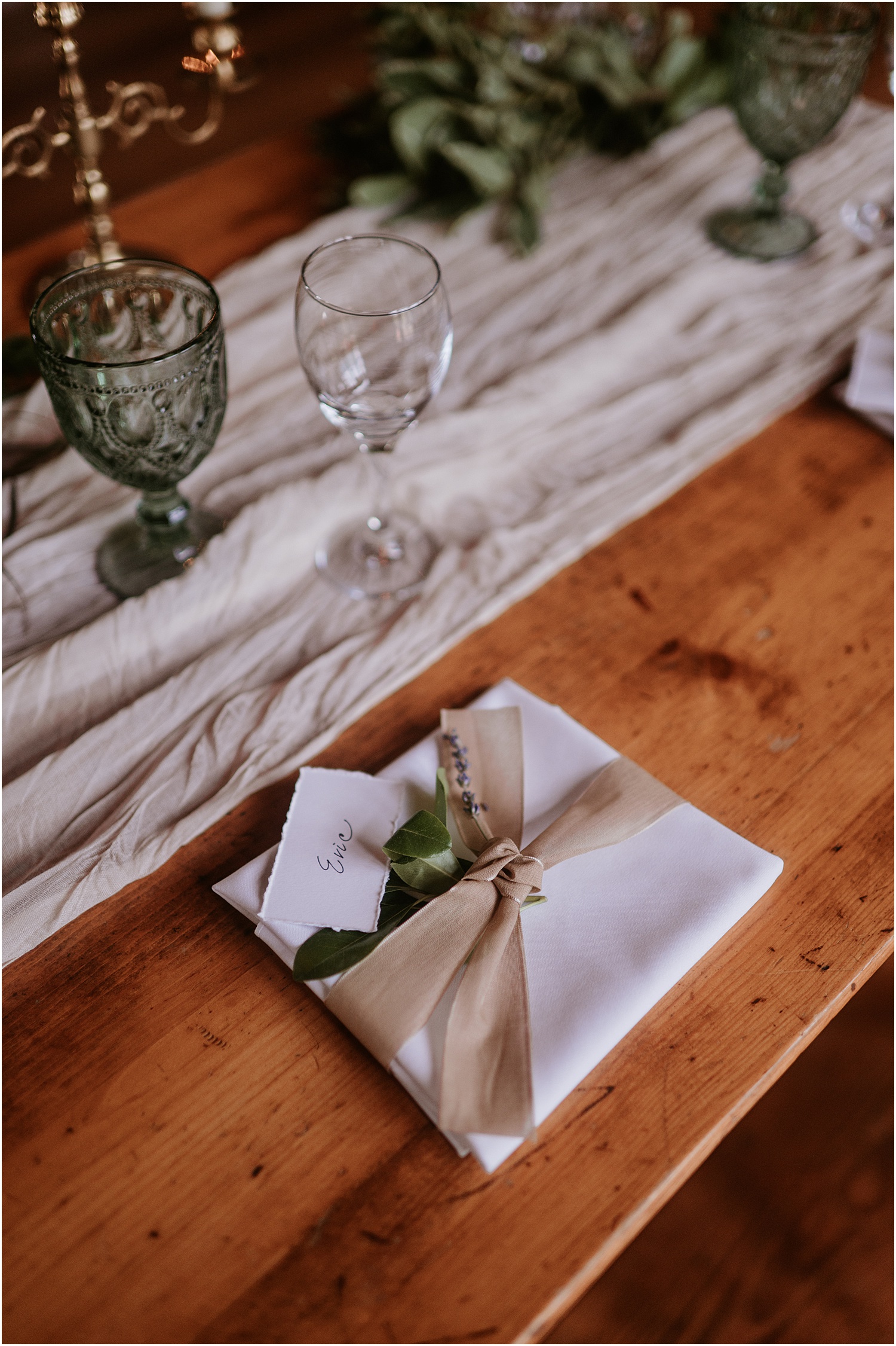 The couple incorporated soft blues, forest greens, and warm whites as their wedding colors which matched the blue sky that set the backdrop for us. (Take a look at the photos to see all of the beautiful green touches like the plants adorning the reception tables, the greenery wrapping around the elegant, white cake, and the soft, beautiful green of the bridesmaid dresses.)