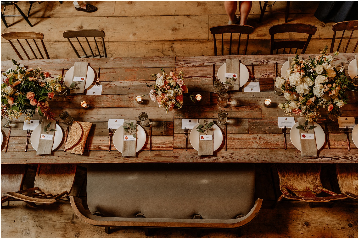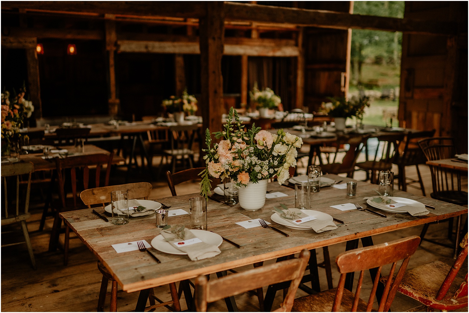 After taking photos, Jordan and James rejoined their guests for a beautiful reception. The barn was transformed into a romantic setting for dinner, with all of the flowers have been locally grown. Throughout the night, guests enjoyed dinner, dancing, and an all-around great time. It was a perfect summer wedding night!