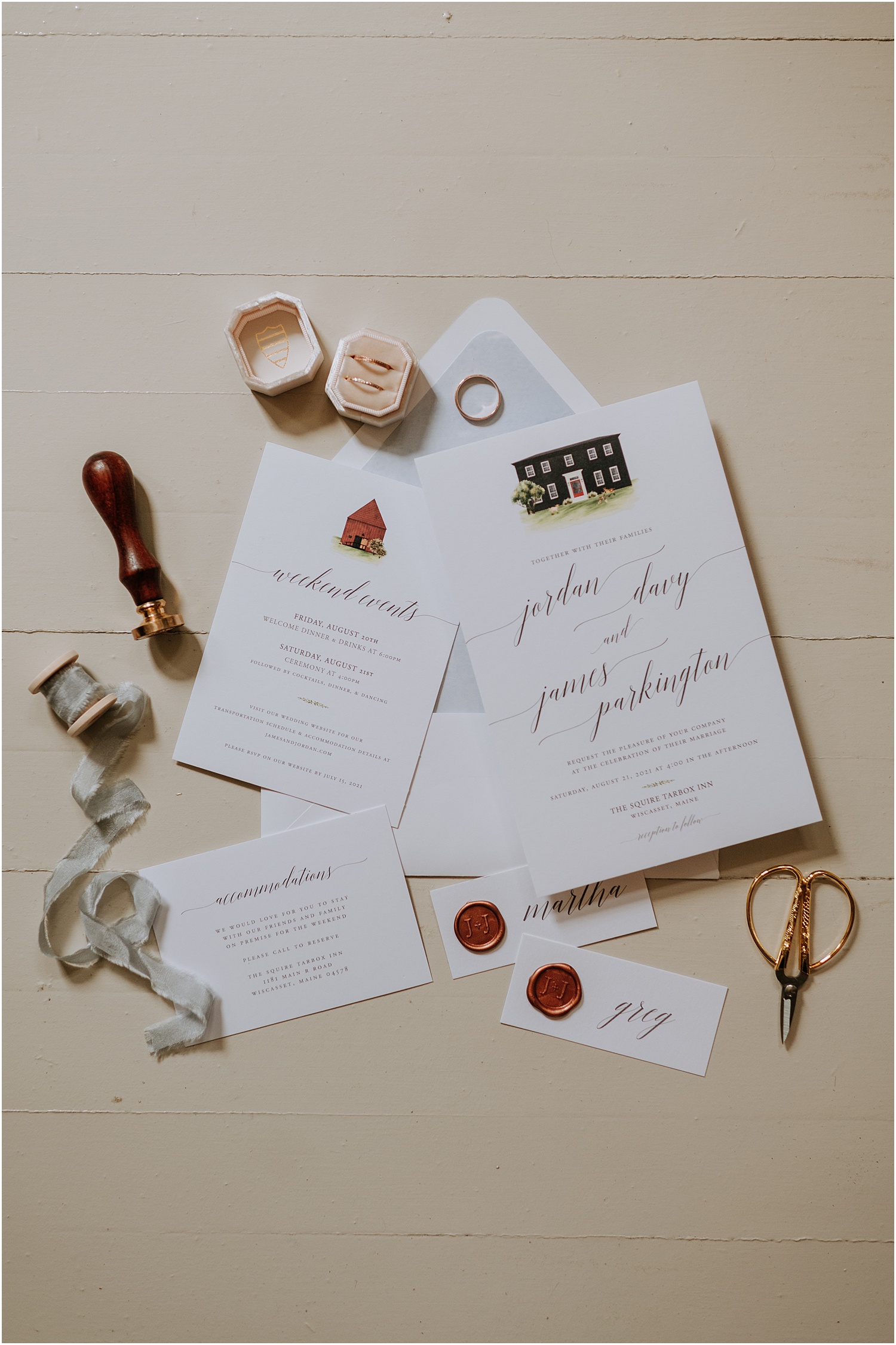 Jordan and James got married at the Squire Tarbox Inn, a beautiful location on the midcoast of Maine, and the most perfect location for a summer wedding. They had 24 of their friends and family stay with them onsite, for a full weekend of wedding celebrations.
